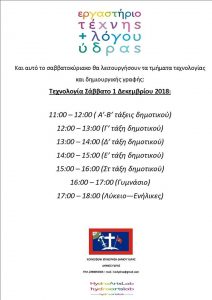 Λειτουργία τμημάτων Τεχνολογίας και Δημιουργικής Γραφής το Σάββατο 1/12/2018