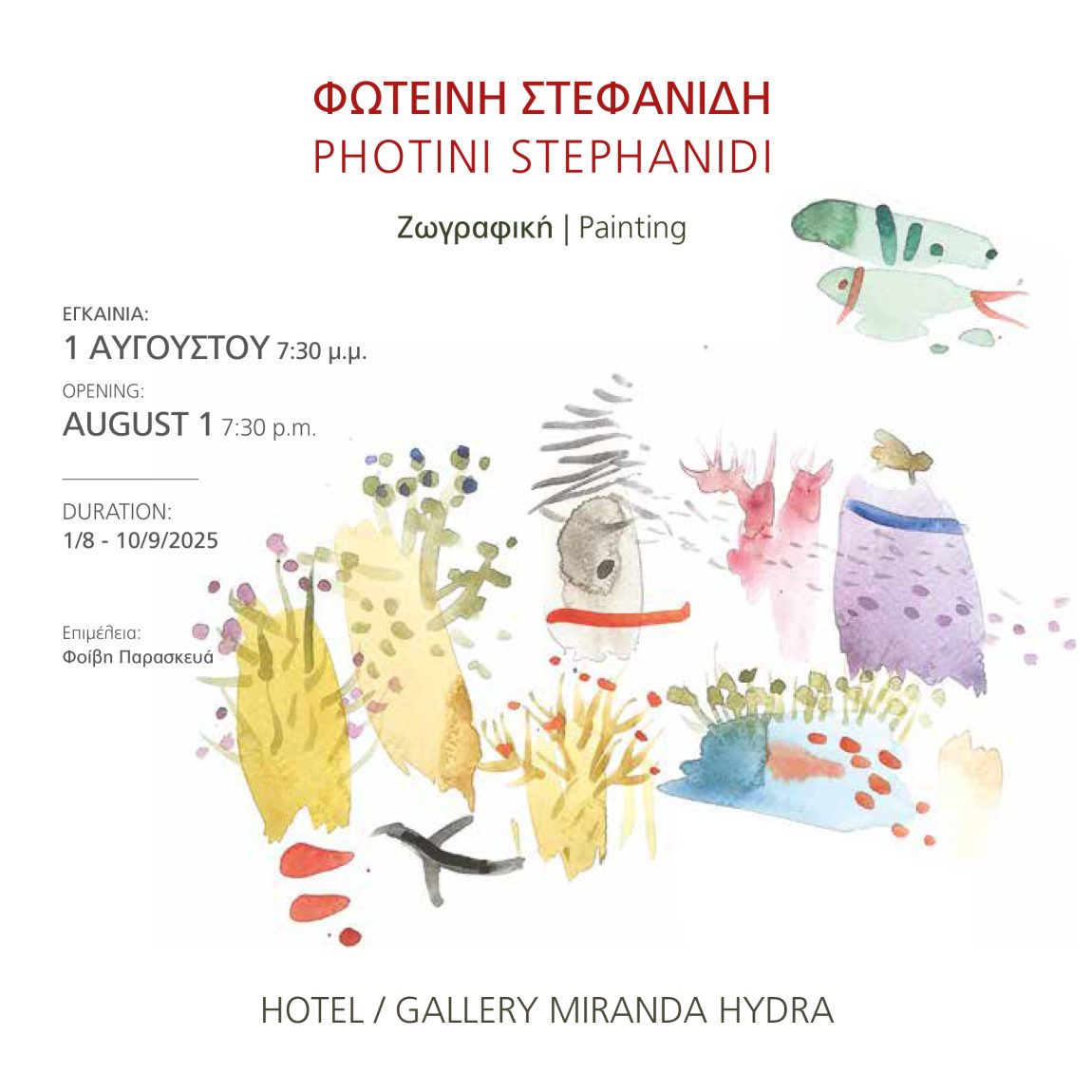 Με μια αναδρομή σε έργα της τελευταίας δεκαετίας, μαζί και μια επιλογή από ακουαρέλες που παρουσιάζονται για πρώτη φορά, εγκαινιάζεται την Παρασκευή 1 Αυγούστου 2025 ατομική έκθεση της Φωτεινής Στεφανίδη στη Γκαλερί του ξενοδοχείου Μιράντα στην Ύδρα. Η αναδρομή περιλαμβάνει έργα από τις ενότητες των Κήπων, των Μηνών και των Ερωτικών Μύθων. Οι ακουαρέλες, δουλεμένες εκ του φυσικού, καταγράφουν άμεσα την αίσθηση και την αύρα της στιγμής. Σε όλη τη δουλειά πρωταγωνιστεί η φύση και κύρια η χλωρίδα, απ’ όπου εμπνέεται αδειάλειπτα η Στεφανίδη σε κάθε ενότητα που πραγματεύεται, ακόμα και στις γνωστές και πολυάριθμες εικονογραφήσεις της.